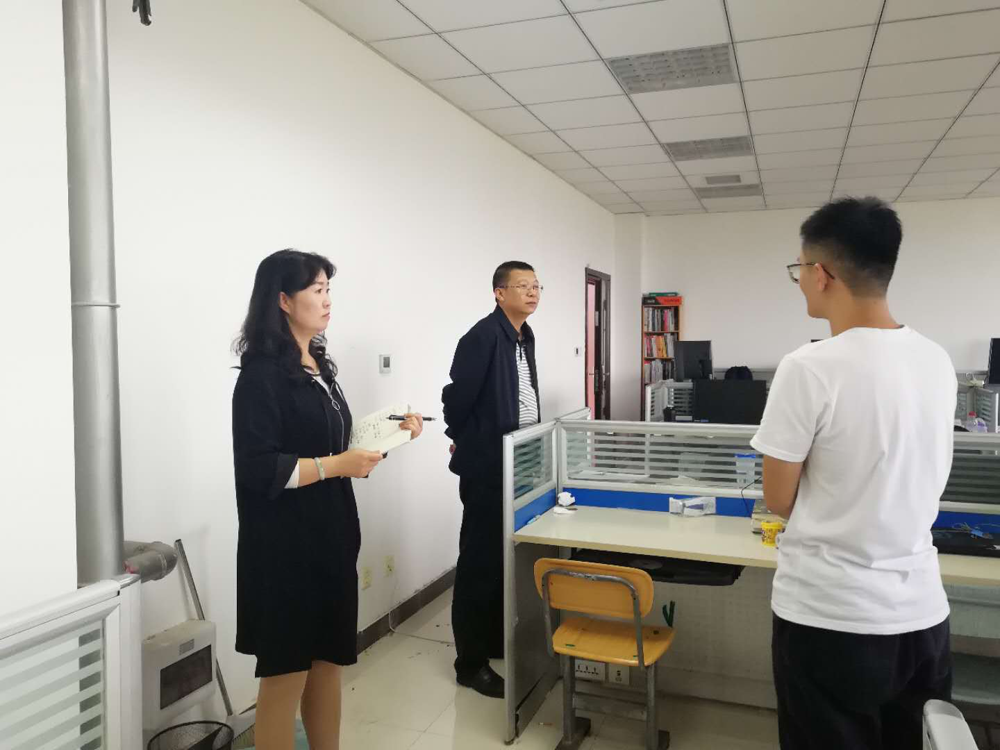 首先,陈书记到各教研室检查中指出存在的安全问题,尤其是安全用电问题,陈洪亮书记边检查边把同学们忘记关闭的电源关掉,并叮嘱各个教研室学生一定要注意用电安全。陈书记指出,同学们尽量不要带食物到教研室和实验室,以防因老鼠引发的出血热等疾病。随后,陈书记还强调安全工作不能有一刻放松,仍需提高警惕,全体师生要牢固树立安全发展理念,提高安全意识,养成良好的安全习惯。特别是十一假期期间,各实验室、教研室等要全员参与,对日常安全工作进行时时处处、全方位、全员排查,要做到防疫情、防火、防盗。王宇英主任对检查出来的安全隐患及时记录,明确专人负责、限时整改,防范于未然,杜绝校园安全事故发生。最后,陈书记代表学院对各教研室、实验室的师生们送去节日的祝福,希望大家节日快乐,科研顺利,学业有成。