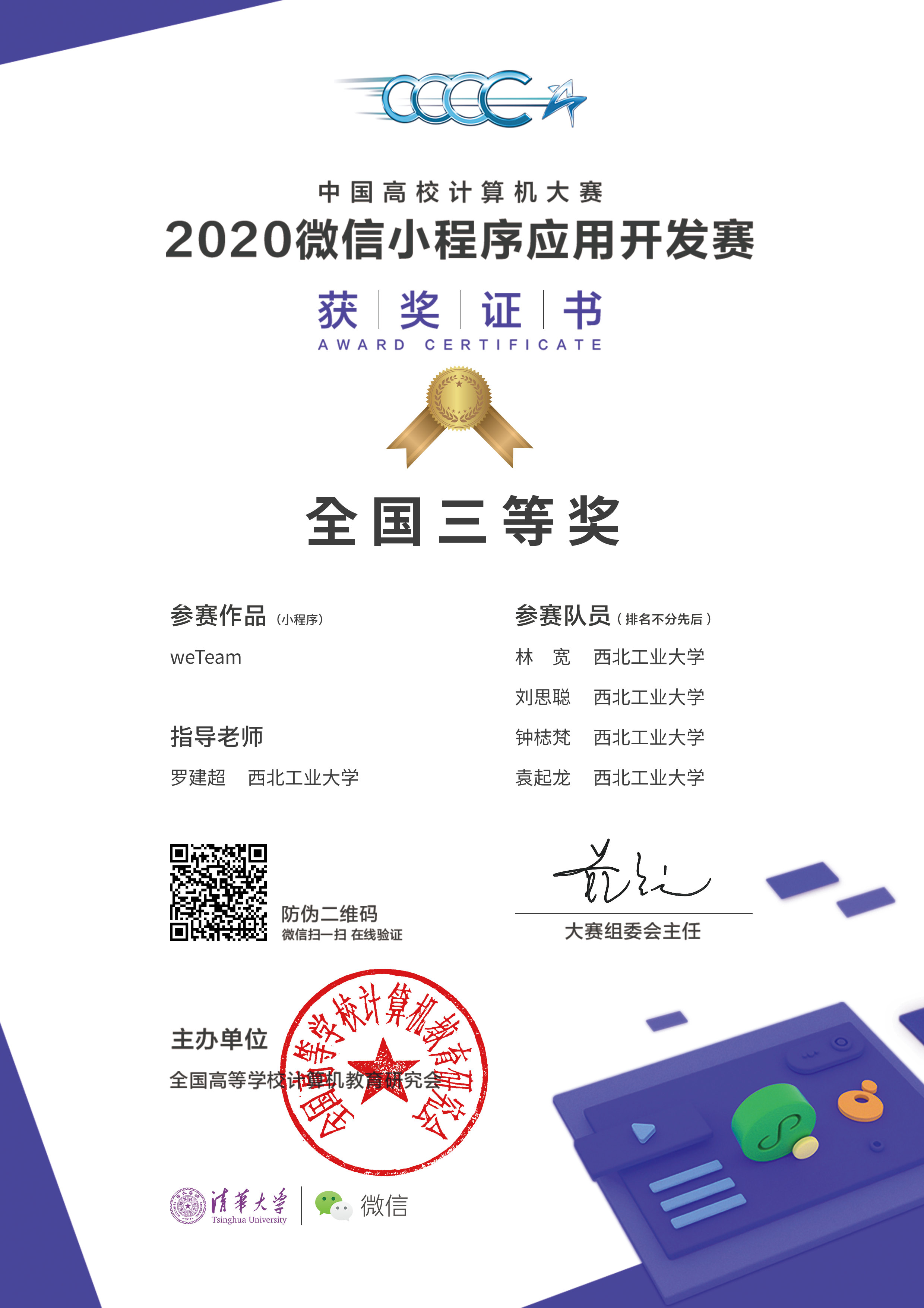 2017级本科生林宽、刘思聪及2018级本科生钟梽梵、袁起龙共同组成。“weTeam”是一款应用于高校竞赛/活动领域的小程序,旨在为各高校学生提供校园竞赛/活动信息一站式查询服务及竞赛/活动组队服务,为组织方提供一个自行发布、管理竞赛/活动的平台。