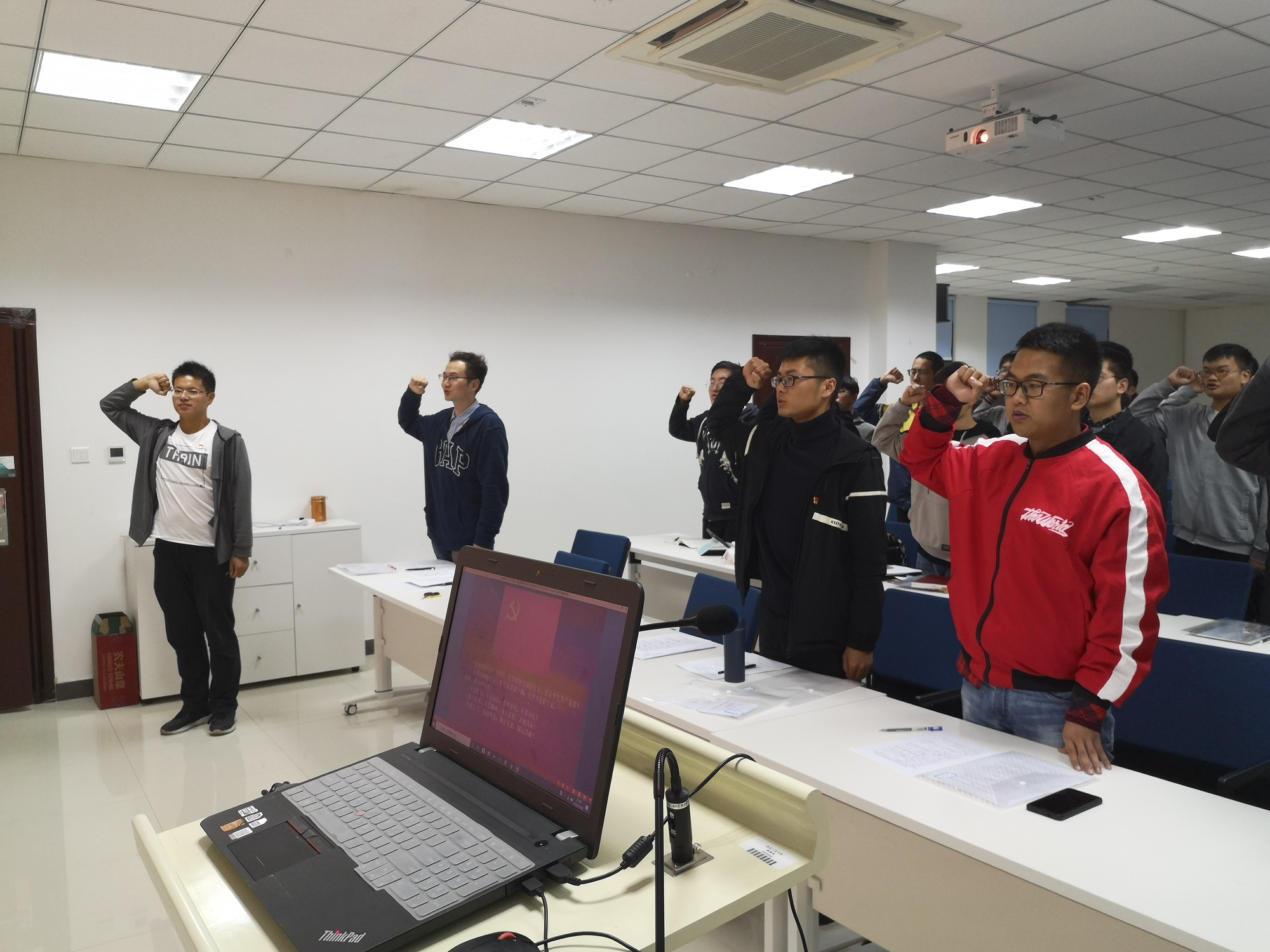 2019年10月25日开展了“不忘初心、牢记使命”主题教育之青年学生党员庆祝中华人民共和国成立70周年主题党日活动。主题教育活动中,支部副书记梁奕桢同志在传达了党中央和学校、学院党委关于开展“不忘初心、牢记使命”主题教育的要求,阐述了主题教育活动的意义后便组织观看开国大典彩色记录影片,而后探寻新中国成立70周年以来的辉煌巨变,探讨青年学生党员身上所肩负的历史使命。主题学习讨论后,支部书记胡轩豪同志带领全体党员进行新时代青年学生党员主题宣誓。