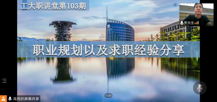 成功举办第103期“工大职讲堂”就业指导讲座。本次“工大职讲堂”邀请到了在海雀科技的贾冰以及三位校友,他们分别是2011级校友廖阳阳、2013级校友郝世杰、2014级校友李文礼三位校友,会议由高翔老师主持,各年级学生参加了此次活动。由于疫情和工作原因,本次“工大职讲堂”以线上方式进行。