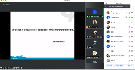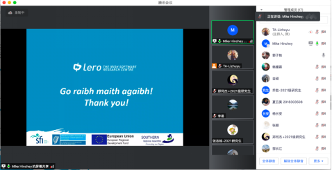 邀请,爱尔兰利默里克大学的软件工程教授Mike Hinchey为我校学生在线上开展了“Evolving Critical Systems/任务关键软件系统演化”课程。这门课程涉及到软件工程领域中软件系统的发展历史以及演化方式,参与到该线上课程的学生有来自成人探花