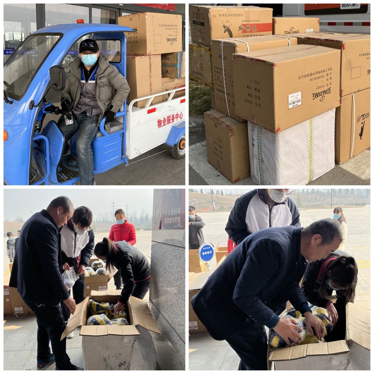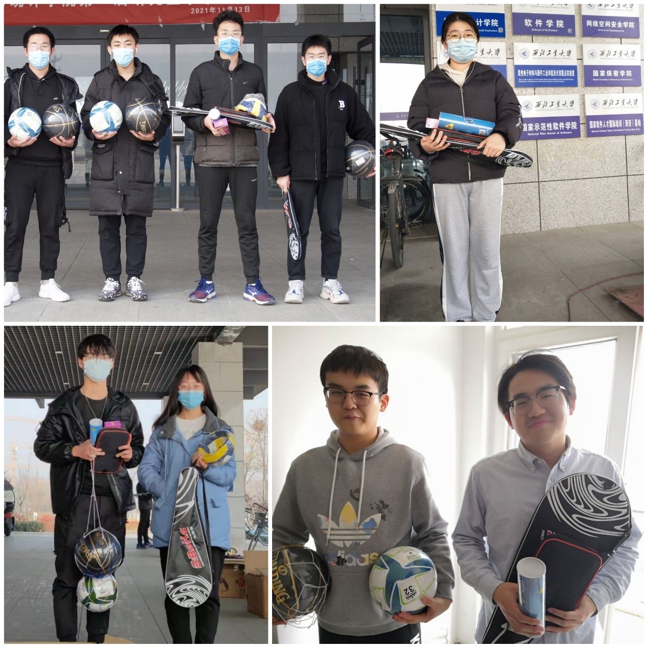 取得联系,并按照在校学生的活动需求,在短时间内采购了一批包括篮球、足球、排球、乒乓球和羽毛球等的体育运动物资,于1月19日紧急联系运输车辆,在对物资进行消杀后,迅速发往长安校区。学院在当日中午顺利接到捐赠物资后,召集学院志愿者,以班级为单位进行了物资的配发。