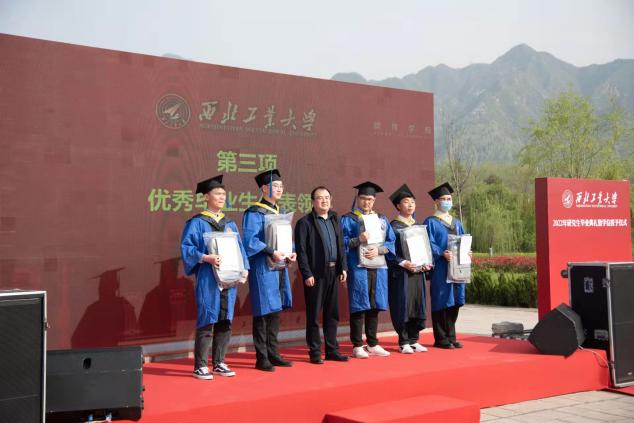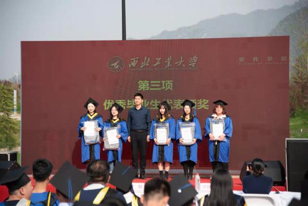 优秀毕业生的表彰决定,郑江滨、李晗分别为优秀毕业生们颁发了奖状和纪念品。同时,李晗希望受表彰的优秀毕业生珍惜荣誉,在今后的学习和工作中继续努力、再创佳绩,为母校争光。紧接着,学院为全体毕业生赠送了具有学院logo的毕业纪念品。