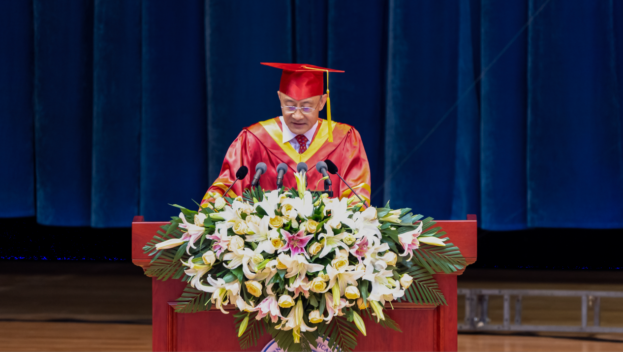 接下来汪校长为全体毕业生送上毕业寄语:希望同学们坚定理想信念,始终心怀“国之大者”,涵养“大我”情怀,把个人命运同国家和民族的命运紧密相连,在惊涛骇浪中定准人生坐标、把准前进航向,在新的赶考之路上走得更高更远!