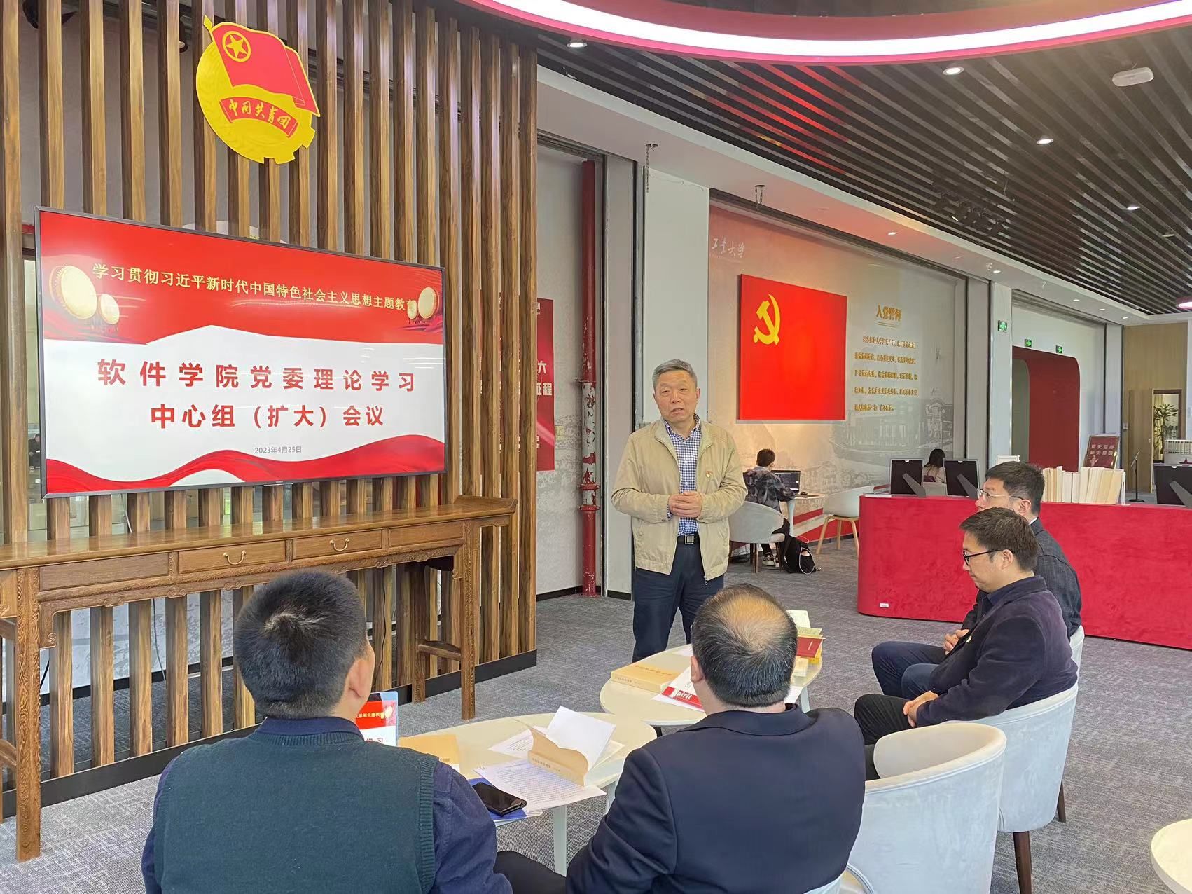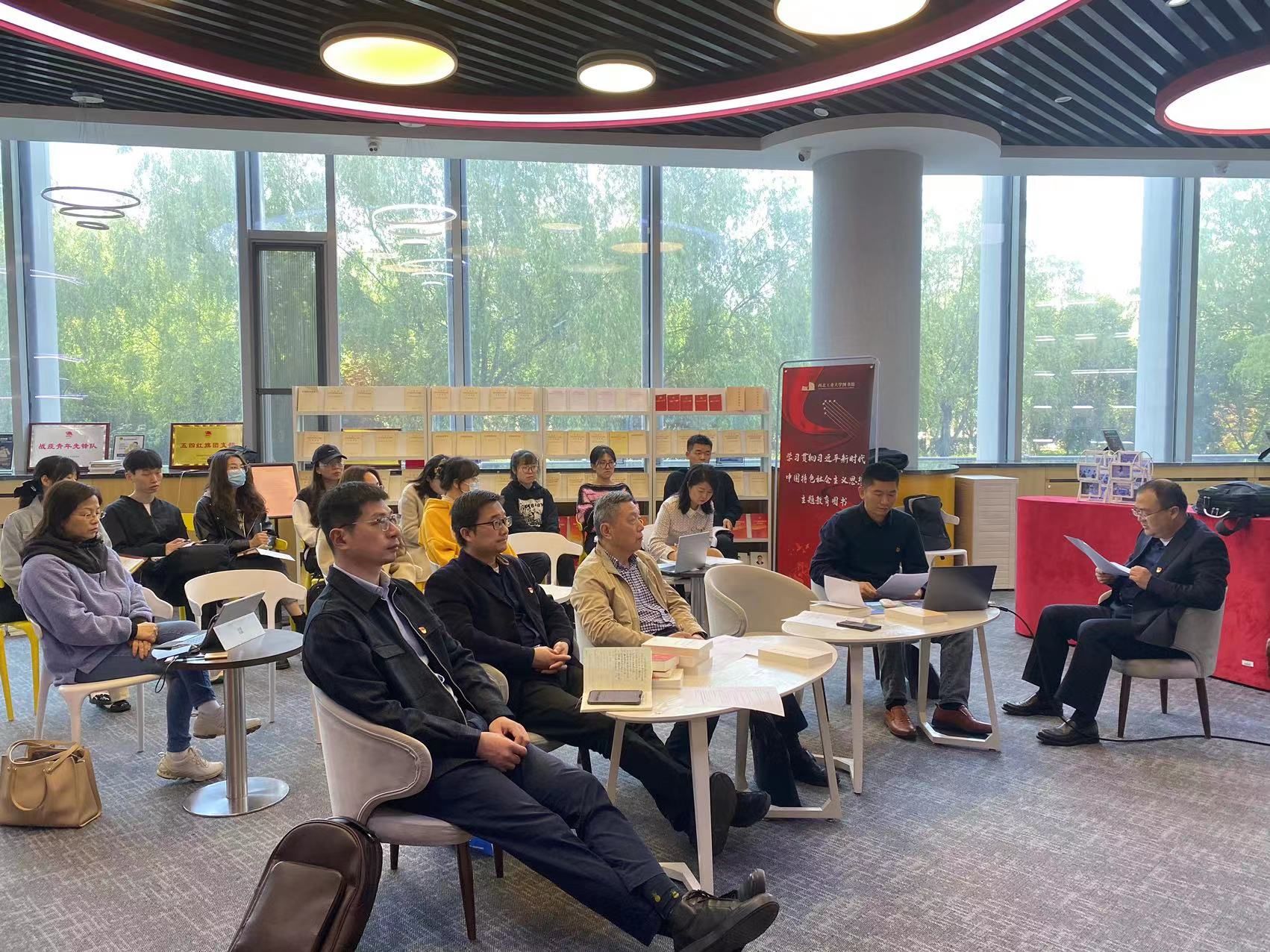 在书屋读原文。书屋墙壁悬挂着“入党誓词”以及主题教育解读展板,书架上摆放了《习近平著作选读》(第一卷、第二卷)《习近平新时代中国特色社会主义思想学习纲要(2023年版)》等多种主题教育读物,营造出主题教育的浓厚氛围。学院院长郑江滨与党委副书记(主持)李晗分别领读了《习近平著作选读》第一卷中的《实现中华民族伟大复兴是中华民族近代以来最伟大的梦想》与《人民对美好生活的向往,就是我们的奋斗目标》,与参会人员一同认认真真读原著,学原文、悟原理。