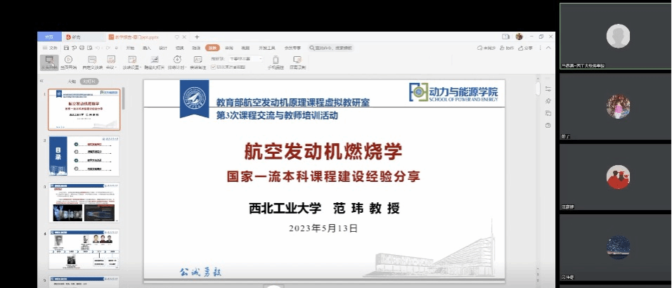 随后,范玮老师以国家级一流本科课程《航空发动机燃烧学》为例介绍了建设经验:合理组织课程教学团队及任务分工;深度挖掘课程特色;建设运用MOOC、虚拟仿真等优质平台资源;优化运用翻转式等课堂教学方式,强化学生课堂参与度、融入感、获得感;将思政元素融入课程教学,做到育人元素漫润式进专业、进课程,有效提升育人水平。范玮老师认为课程建设不是一蹴而就的事情,是教学资源沉淀积累传承的过程,要根据一定的思想和理论,选择和组织教学内容、教学方法和教学管理手段,制定教学评价原则,最终通过一系列的成果体现出来。
