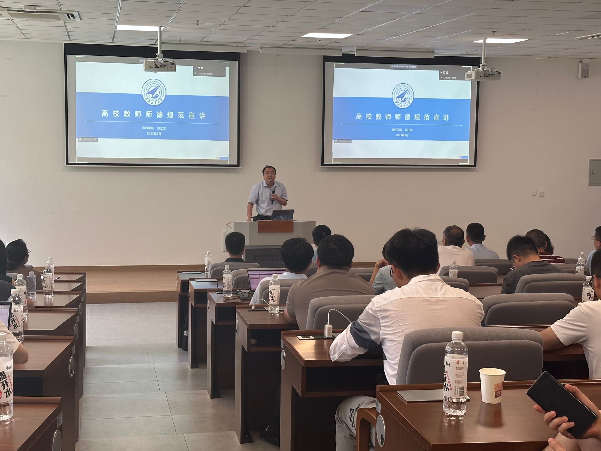 会议第二项,学院院长郑江滨作《高校教师师德规范宣讲》,带领全体教职工学习了习近平总书记关于教师队伍建设的重要指示批示精神和国家关于高校教师师德规范相关文件要求,对《新时代高校教师职业行为十项准则》《研究生导师指导行为准则》《关于高校教师师德失范行为处理的指导意见》《成人探花