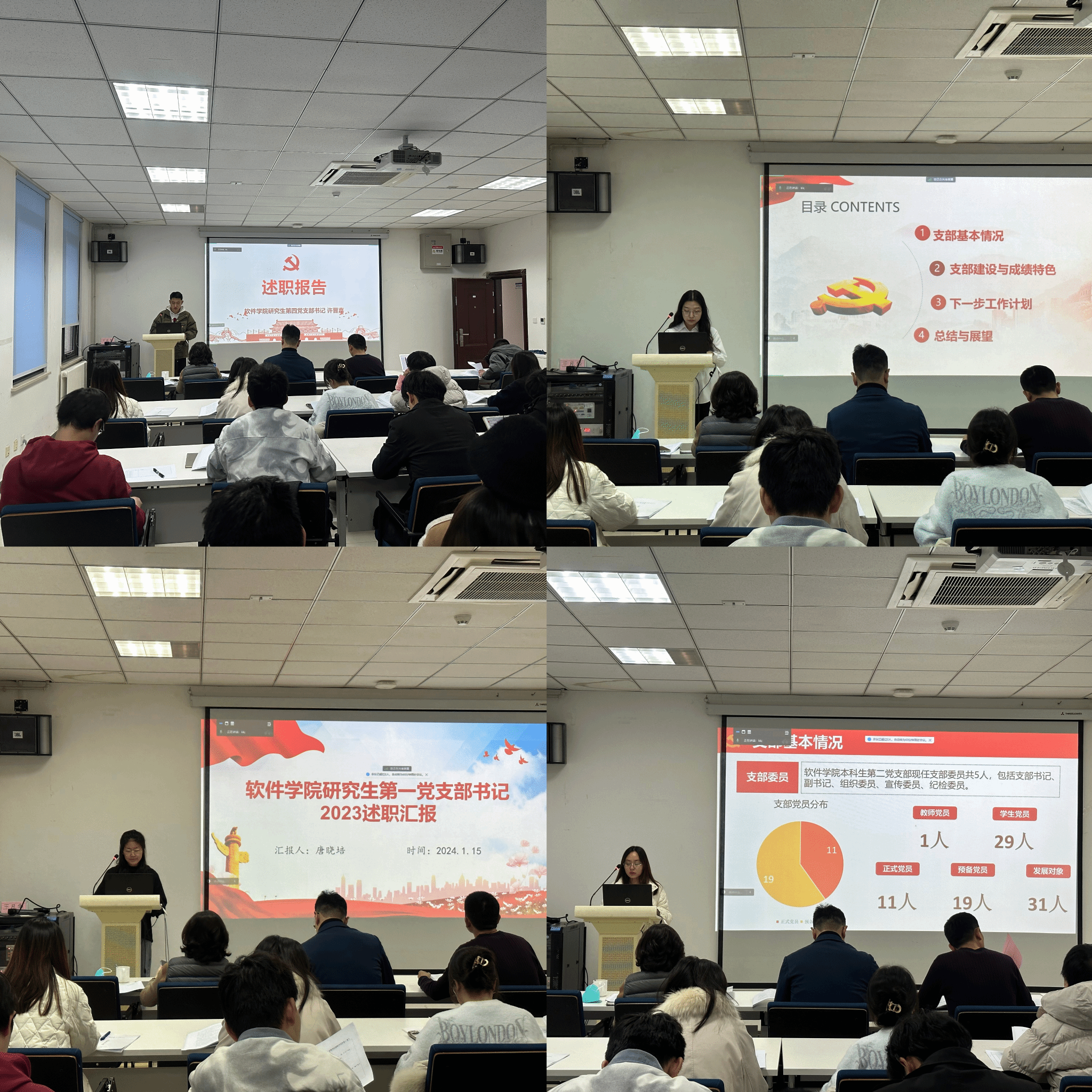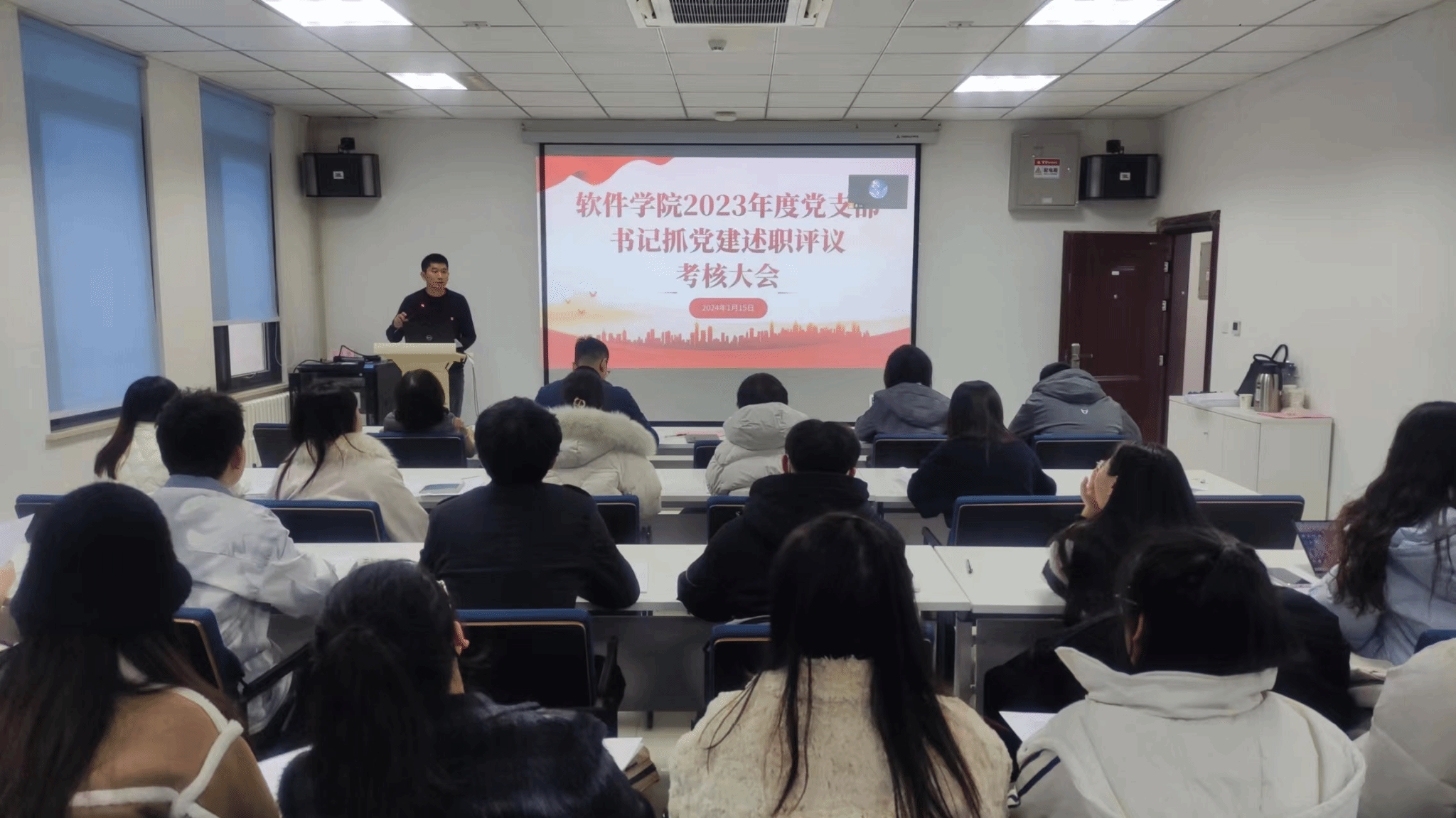 党委书记李晗、副书记张龙、副院长马春燕、党委委员蔡康英、辅导员腾红磊及教职工党员代表、学生党员代表出席会议并担任评委。14个党支部书记参加了此次会议。会议由李晗主持。