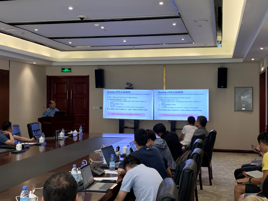 刘志明教授向参会老师解读了重点项目申请书中有关的科学问题、核心概念、和主要的技术思想,并作了做题为《从rCOS到HCPS的接口模型》的报告,详细介绍人机物融合系统接口模型的定义方法。