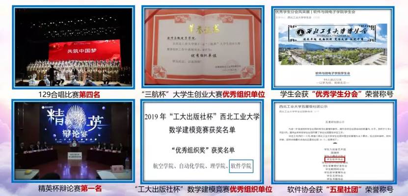 学院获129合唱比赛第四名,精英辩论赛第一名,三航杯创业大赛和数模比赛优秀组织单位奖,学生会被评为“优秀学生分会”,软件协会被评为 “五星级社团”。