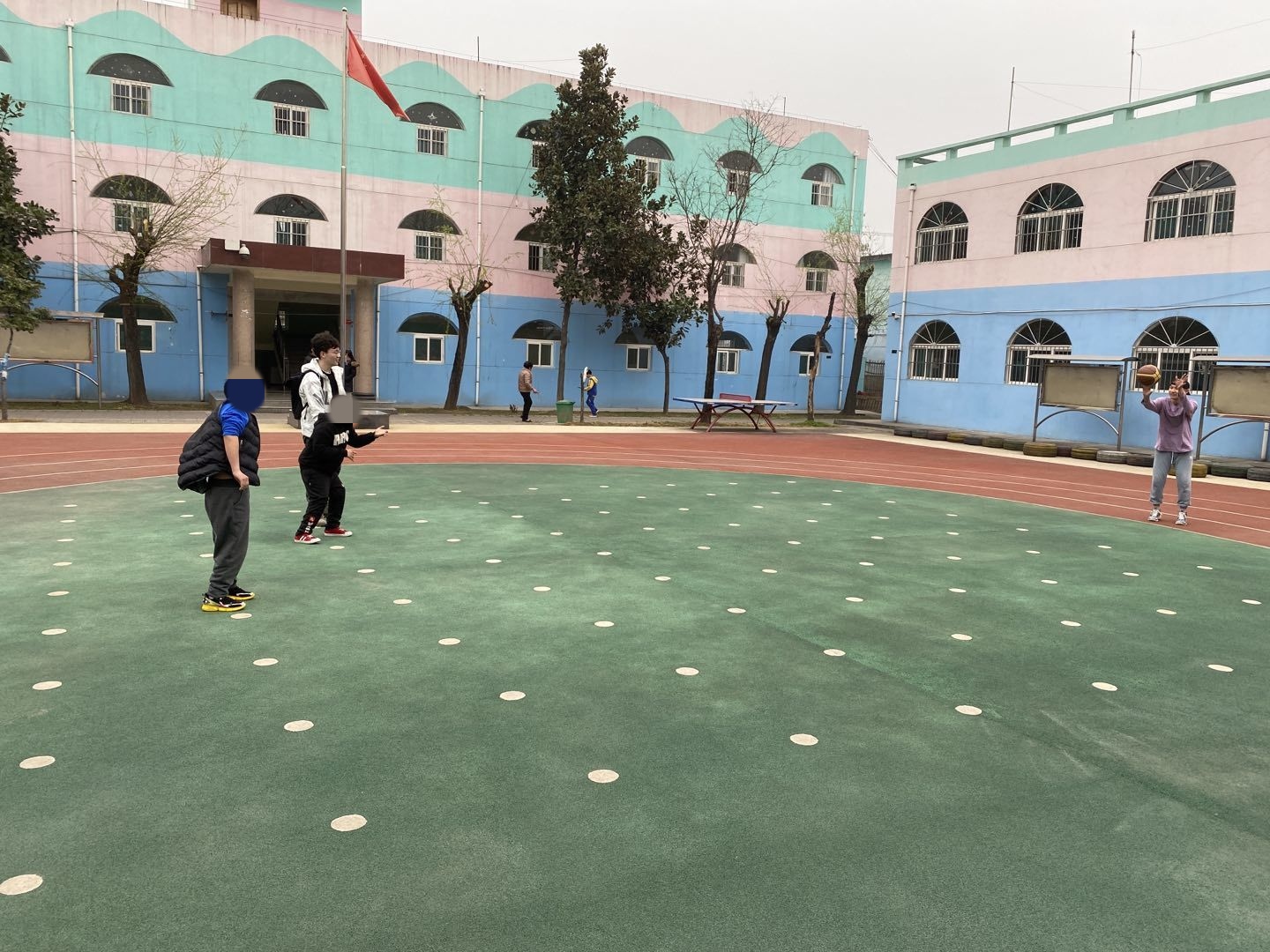 在操场上,志愿者带着孩子们打篮球,丢沙包,玩cosplay,孩子们玩得非常开心,一张张灿烂的笑容浮现在脸上。