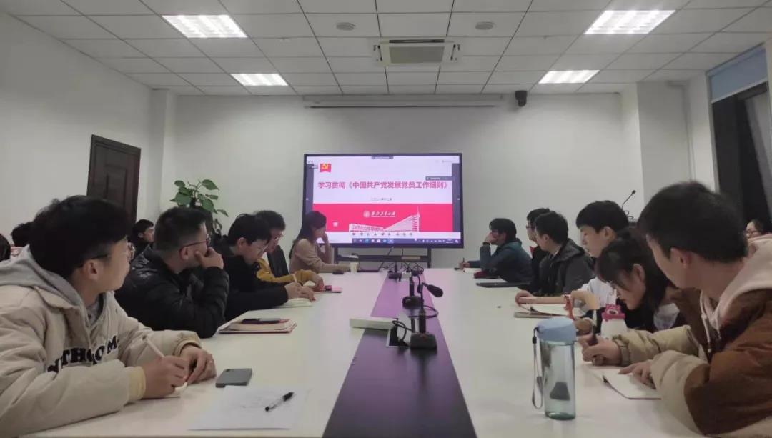 于12月1日晚7点在启翔楼303室组织开展支部委员培训会。本次会议邀请学校组织部组织员麻美龄老师为全体支部委员作题为《学习贯彻〈中国共产党发展党员工作细则〉》的专题培训。