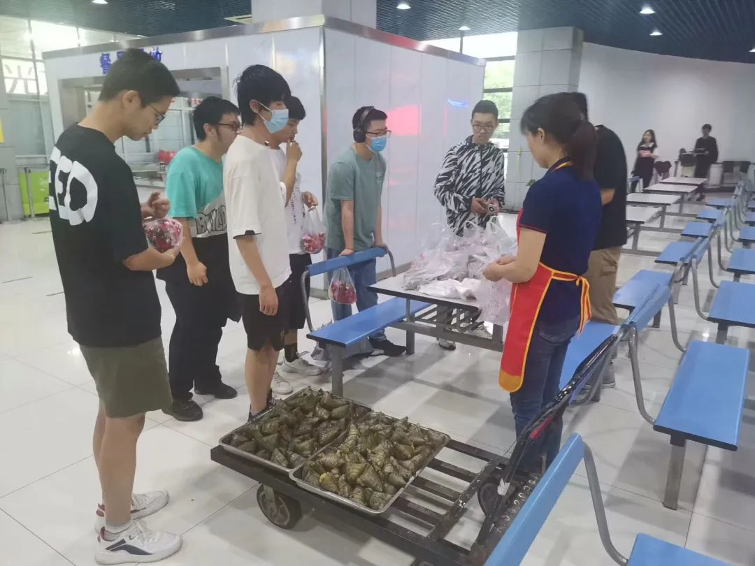 热气腾腾的粽子在云天苑餐厅出锅,一份份地装好,和精致的香包一起等待着同学们来领取。随粽子和香囊一同赠出的,还有来自成人探花