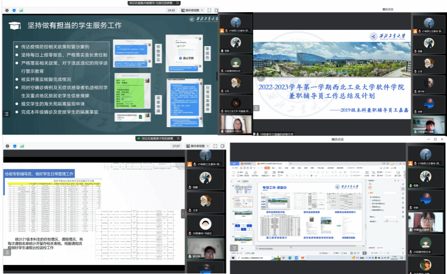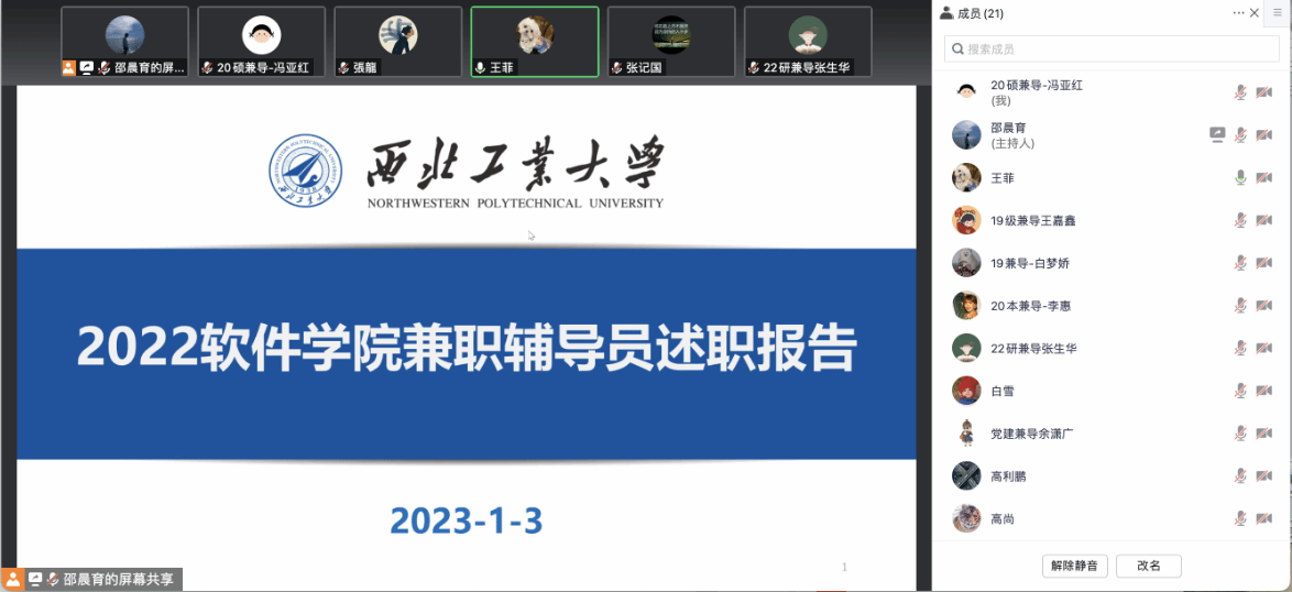 为加强成人探花 学工队伍建设以及兼职辅导员队伍建设,全面客观评价兼职辅导员工作实绩,充分调动兼职辅导员工作积极性、主动性和创造性,促进兼职辅导员认真履行岗位职责,1月3日上午,成人探花 组织开展2022年度兼职辅导员述职考核,成人探花 党委副书记(主持工作)李晗、党委副书记张龙、各专职辅导员、学生工作助理和兼职辅导员通过线上方式参会。会议由研究生学生工作助理王菲主持。