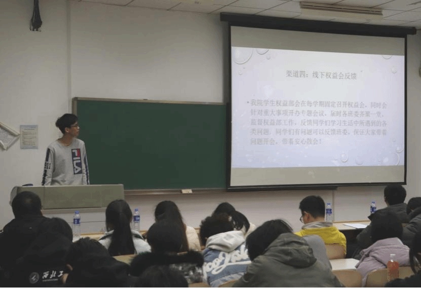 随后,权益部负责人曹翊宸向学生代表详细阐述学生权益反馈途径,涵盖线上问卷调查、群聊意见反馈等多种形式。关于收集和讨论学生权益问题提案的议程正式展开。