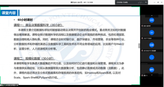 首先,肖老师向大家介绍了项目情况。墨尔本大学2020创新、创业企业领导力项目为期十天,来自我校不同学院的17位学生参与其中,项目内容主要包括:企业家、企业高管以及商学院知名讲师讲授企业知识以及亲临企业见习、创业策划培训、学生社交活动、颁发结业证书以及澳洲名校访问和悉尼歌剧院文化参观等。旨在提供给学员与澳洲企业家,企业高管面对面交流、学习的机会,从而培养学生的创新意识和创业领导力。加拿大麦吉尔大学大数据专业课程学习项目,为期3周共60学时,学生将学习如何利用定量分析方面的优势,从大型数据集中推断出有意义的业务见解。课程将向学生介绍实用的工具,以帮助学生了解如何大规模地处理数据,共包含两门课程:“商业决策数据科学”课程(30学时),“大规模数据”课程(30学时)。平均每天4学时,要求学生必须具备理工科或商科中的管理信息系统专业背景,且具备较强的数据与统计学知识,以及Linux、Java与 SQL方面的技能。
