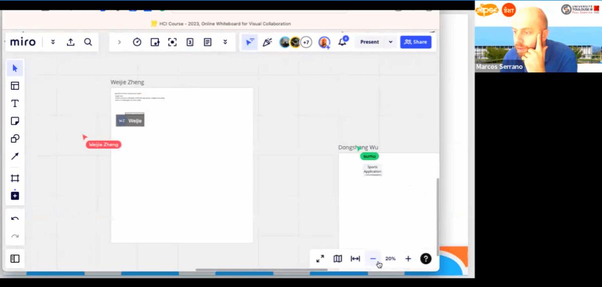 本次课程是Marcos教授首次面向成人探花 的学生授课。在正式开课之前,Marcos教授先向同学们做了自我介绍,然后以学术汇报的形式向大家简要介绍了他最近的科研成果。教授全程通过miro平台与学生们进行互动,了解了同学们的专业方向以及对人机交互的认识,以此作为本次人机交互课程的引入。