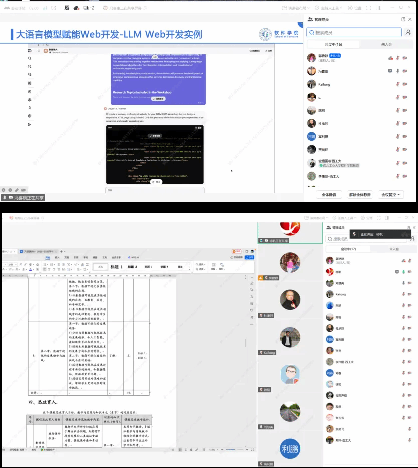 各课程负责人围绕“AI技术融合路径”和“数智课程建设规划”两大核心,以PPT形式汇报教学大纲的优化内容,详细阐释课程目标、内容设计、教学方法及评价机制的更新与调整。评审专家从课程前沿性、教学创新性、AI赋能实效等维度进行逐一点评,并提出针对性修改建议。学生代表也从学习体验与实际需求出发,积极建言献策。