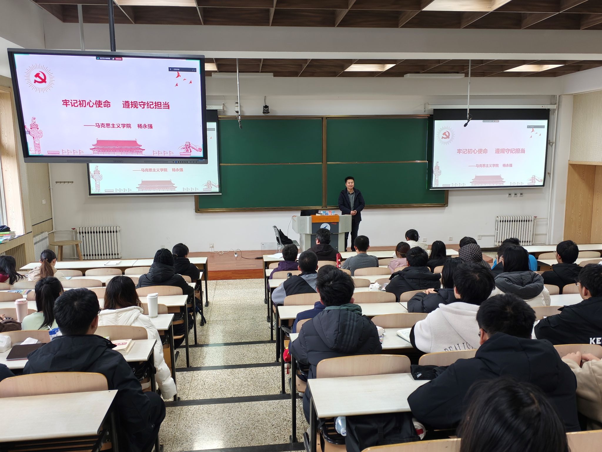 杨永强以《牢记初心使命,遵规守纪担当》为题,讲述了中国共产党不忘初心、牢记使命、艰苦奋斗的精神。他强调政治纪律是最根本、最关键的纪律,必须遵守党的基本理论、基本路线、基本纲领、基本经验和基本要求。结合苏联亡党亡国的历史反思,强调了党的组织原则和组织纪律的重要性,以及坚持党的先进性和纯洁性的重要性。