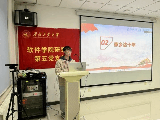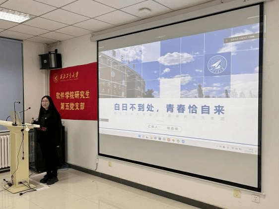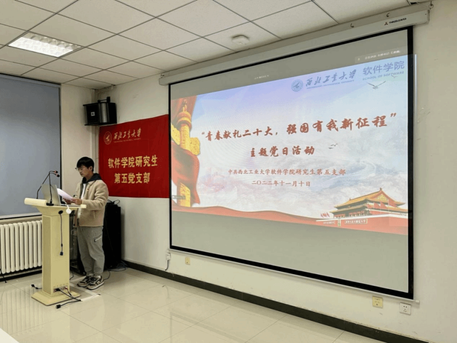 研究生第五党支部在启翔楼401报告厅开展“青春献礼党的二十大 强国有我新征程”主题党日活动,活动共分为“中国道路中国梦·奋斗正青春”、“中国道路中国梦·家乡这十年”、“中国道路中国梦·初心向未来”三个部分,向胜利闭幕的党的二十大隆重献礼。活动伊始,在支部书记王嘉鑫的带领下,全体同志起立,共同奏唱了国际歌,为活动拉开序幕。