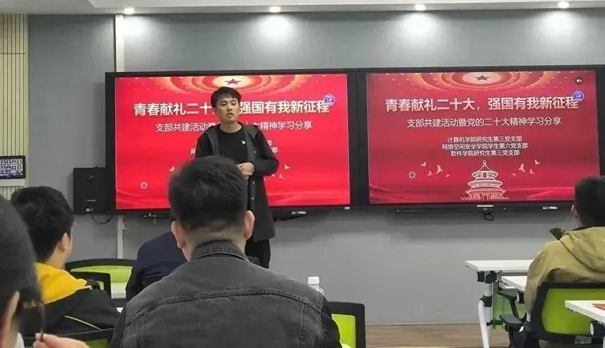 11月13日,为深入贯彻学习党的二十大精神,重温建党历程,成人探花 研究生第三党支部、网络空间安全学院学生第六党支部和计算机学院研究生第三党支部于教学东楼C座309室共同举办青春献礼党的二十大,强国有我新征程,支部共建活动暨党的二十大精神学习分享活动。本次活动由计算机学院研究生第三党支部书记范文超主持,一共分为四个部分。
