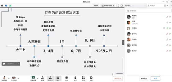 本次分享会由支部内的多名已经成功保研或出国留学的支部成员组成分享团队,针对高年级学生关心的保研问题和出国留学问题进行支部内部分工,从不同的角度和层面,向同学们介绍了自己的经验和心得,并回答了同学们提出的各种问题。